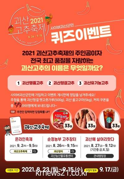 이벤트에 참가하려면 사이버 괴산군민으로 가입하고 사이버 괴산군민 홈페이지(www.goesan.go.kr/cyber/index.do)의 이벤트 참여 게시판에 2021 괴산고추축제 응원 댓글과 함께 퀴즈 정답을 남기면 된다.