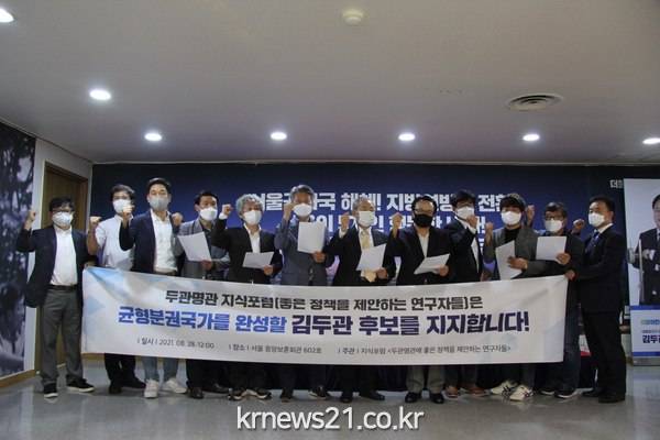 오늘(28) 낮 12시 여의도 중앙보훈회관에 위치한 김두관 두드림 캠프 사무실에서 열린 지지 선언에서 이들은 “대한민국 균형발전과 혁신성장 정책을 공약으로 한 김두관 후보의 ‘균형분권국가 완성’을 공식 지지한다.”고 발표했다.