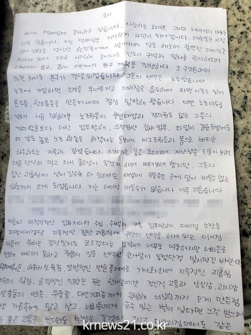 경찰에 따르면 세 아이의 아버지인 이씨는 사망 현장에 A4지 2장에 걸쳐 직접 쓴 편지를 남겼다. 편지엔 민노총 산하 전국택배노조에 대한 원망이 담겼다. 조합원들을 향해 “너희로 인해 버티지 못하고 죽음의 길을 선택한 사람이 있었단 걸 잊지 말길 바란다”고 했다.