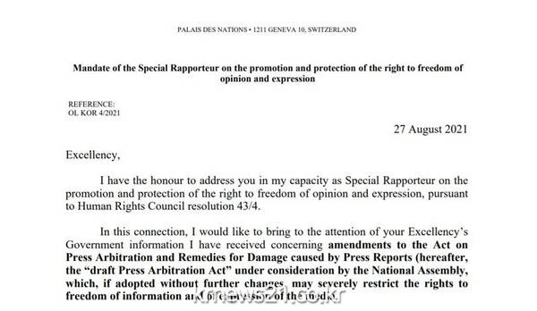 아이린 칸 유엔 의사·표현의 자유 특별보고관은 1일 유엔 인권최고대표사무소(OHCHR) 홈페이지에 공개된 8월 27일자 서한에서 언론중재법 개정안이 국회에서 추가 수정 없이 통과되면 정보의 자유와 언론 표현의 자유를 심하게 제한할 수 있다는 우려를 제기했다.