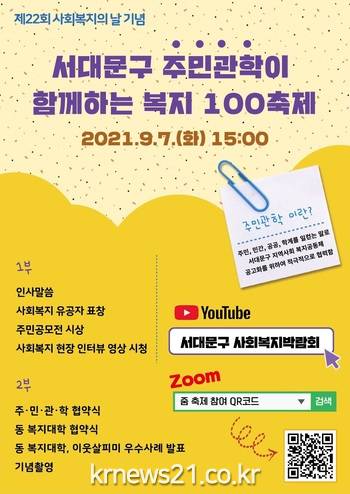 ▲ [사진=홍보포스터]서대문구가 제22회 사회복지의 날인 9월 7일 오후 3시 관내 70여 개 사회복지기관 및 시설 종사자, 학계와 공공기관, 복지단체 대표, 주민 등 100인이 함께하는 ‘서대문구 복지100축제’를 개최한다.
