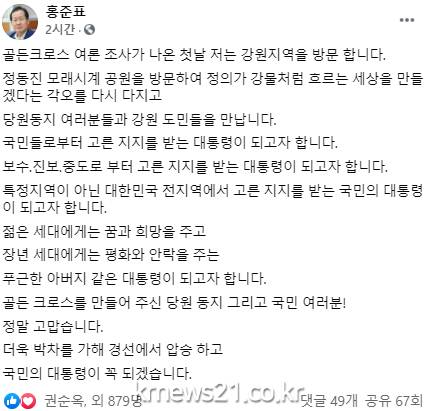 여론 조사 결과가 나오자 홍 의원은 즉시 자축했다. 그는 자신의 페이스북을 통해 “드디어 골든크로스를 이뤘다”며 “20대, 30대, 40대에서 상대후보 보다 평균 14%나 앞서고 호남에서도 앞서고 전국 골고루 앞서고 충청지역과 60대에서만 지고 있지만, 확장성 면에서는 상대를 압도한다”고 주장했다.