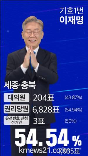 5일 발표된 세종·충북 득표율 결과, 이재명 후보는 총 투표수 1만2899표 중 7035표(54.54%)를, 이낙연 후보는 3834표(29.72%)를 얻었다. 이어 추미애 후보(7.09%), 정세균 후보(5.49%), 박용진 후보(2.22%), 김두관 후보(0.93%) 순이었다.
