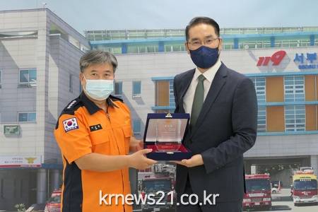 ▲ [사진제공 = 대전광역시]대전서부소방서는 3일 서장실에서 화재피해 취약계층에 지정기탁금을 기부한 고석찬 목사(대전중앙장로교회)에게 감사패를 전달했다고 밝혔다.