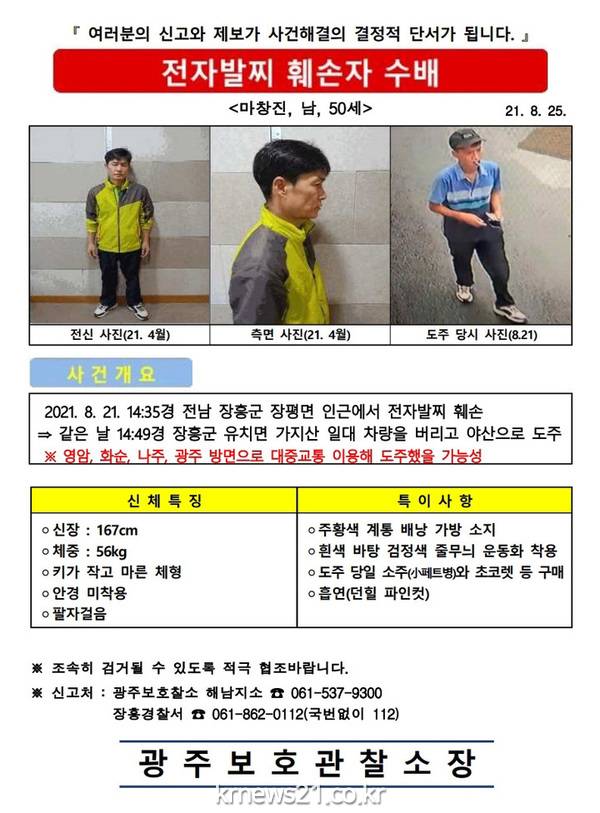▲ [이미지제공 = 광주보호관찰소]전남 장흥에서 위치 추적 전자장치(전자발찌)를 훼손하고 도주한 성범죄 전과자 마창진(50)이 공개 수배 16일 만에 경찰에 검거됐다.