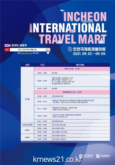 인천광역시(시장 박남춘)와 인천관광공사(사장 민민홍)는‘2021 인천 국제 트래블마트(2021IITM)’를 8월 7일부터 9일까지 3일간 온라인으로 개최한다고 밝혔다.