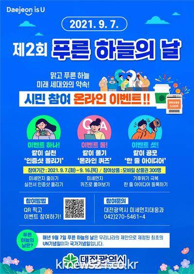 ▲ [사진=홍보포스터]대전시는‘제2회 푸른 하늘의 날’을 맞이해 9월 7일부터 9월 16일까지 10일간 시민참여 온라인 퀴즈 이벤트를 진행한다.