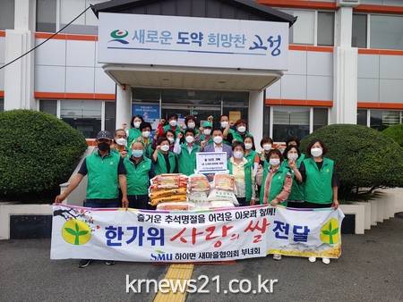 ▲ [사진제공 = 고성군]하이면 새마을지도자협의회(회장 우상원)·새마을부녀회(회장 권두남)는 9월 7일 하이면사무소를 방문해 10kg 쌀 50포대(300만 원 상당)를 기탁했다.