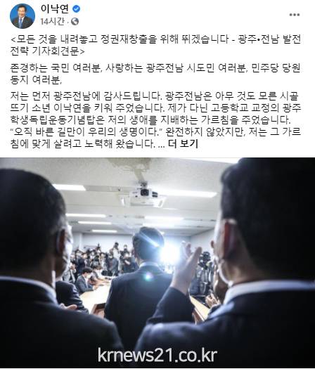 이 전 대표는 이날 오후 3시 광주광역시의회에서 기자회견을 열고 "저를 임기 4년의 국회의원으로 만들어 주신 종로구민들게 한없이 죄송하다"면서 "저의 모든 것을 던져 정권 재창출을 이룸으로써 민주주의와 민주당, 대한민국과 호남, 서울 종로에 진 빚을 갚겠다"고 말했다. .