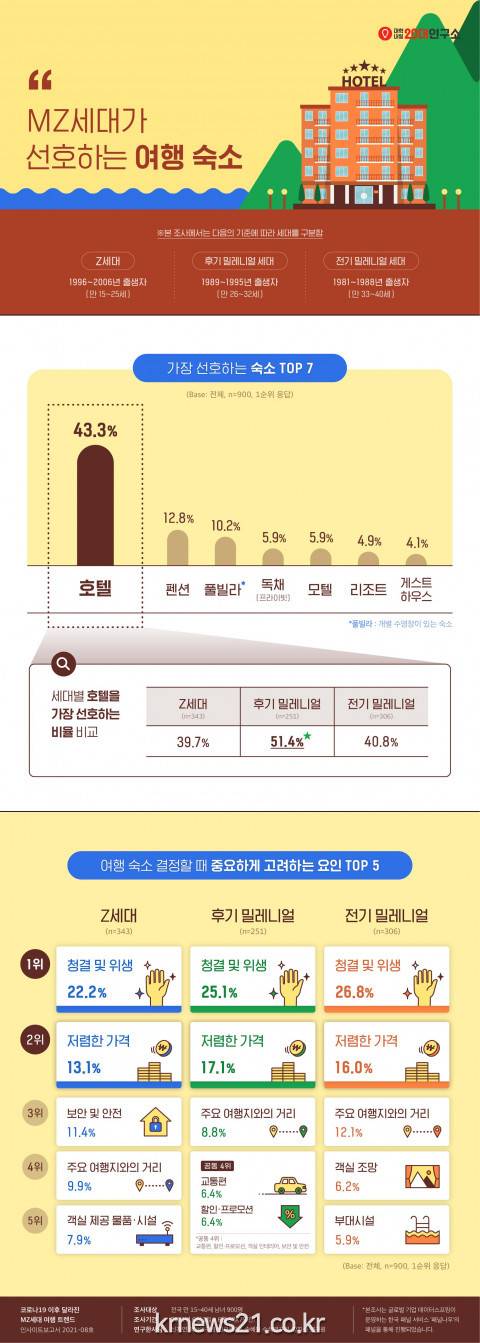 밀레니얼 세대와 Z세대 모두 가장 선호하는 숙소는 ‘호텔(43.3%)’이었다. 특히 후기 밀레니얼의 호텔 선호도가 51.4%로 가장 높았으며, 호텔 다음으로는 펜션, 풀빌라, 독채와 같이 다른 이용객과 독립된 형태의 숙소를 선호했다.