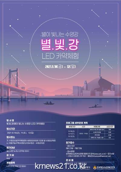 ▲ [사진=홍보포스터]부산시(시장 박형준)는 내일(10일)부터 12일까지 수영강에서 ‘별이 빛나는 수영강 LED 카약 체험’ 행사를 개최한다고 밝혔다.