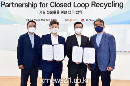 LG화학은 9일, 서울 잠실 쿠팡 본사에서 LG화학 허성우 부사장과 쿠팡 라이언 브라운(Ryan Brown) 부사장 등 양사 경영진이 참석한 가운데 ‘플라스틱 재활용 및 자원 선순환 생태계 구축’을 위한 업무협약(MOU)을 체결했다고 밝혔다.