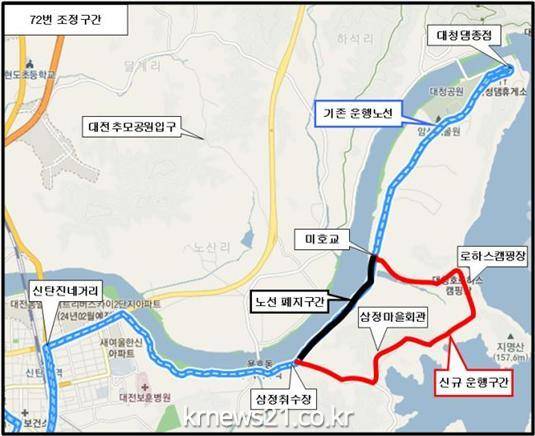 아울러, 72번 노선은 대덕구 삼정마을과 대청호로하스 캠핑장을 추가 경유하는 것으로 조정했으며, 75번은 세종시 대평리까지 운행하던 종점을 세종터미널까지 연장 운행한다.