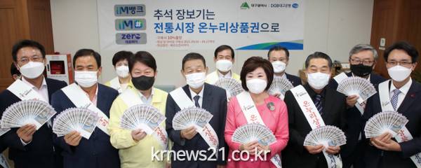 ▲ [사진제공 = 대구광역시]대구시는 추석 명절을 맞아 관내 유관기관․단체 등이 참여하는 온누리 상품권 판매촉진 행사를 9일(목) 오전 11시에 대구은행 시청지점 영업부에서 개최하고, 대구시, 산하기관, 구·군 전 부서가 참여해 코로나19로 어려움을 겪고 있는 전통시장을 방문 및 온라인으로 장보기 행사를 17일(금)까지 진행한다.