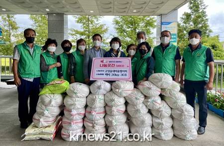 ▲ [사진제공 = 고성군]고성읍새마을지도자협의회(회장 김권수)에서 추석명절을 맞이하여 9월 10일 희망나눔 쌀 20kg 36포를 고성읍 『나눔곳간』에 기탁해 따뜻한 이웃사랑을 실천했다.