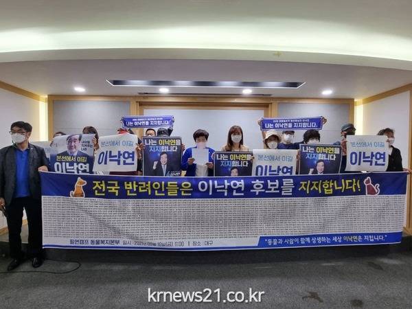 오위숙 대구동물보호연대 대표 등 전국 반려인 단체의 주요 대표와 임원들은 10일 오전 개시장으로 유명한 대구 칠성시장에서 업종 전환을 추진 중인 육견 상인 2명과 함께 ‘동물과 사람이 함께 상생하는 세상 이낙연이 지킵니다’라는 내용의 지지선언 행사를 가졌다.