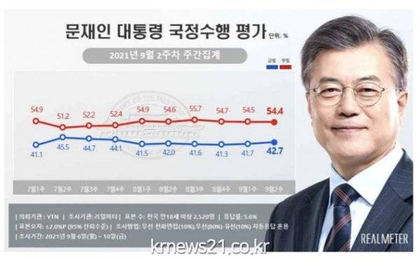 여론조사 전문업체 리얼미터가 YTN 의뢰로 지난 6~10일 전국 18세 이상 유권자 2520명을 대상으로 조사한 결과 문 대통령에 대한 국정수행 긍정평가(매우 잘함 24.1%, 잘하는 편 18.6%)는 전주보다 0.4%포인트 오른 42.7%로 조사됐다.