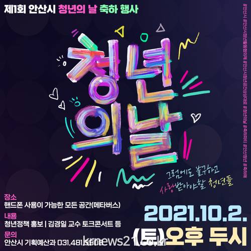 행사는 10월2일 오후 2시 메타버스 플랫폼에서 청년의 날 기념 인트로 영상을 시작으로 ▲청년의 날 유공표창 ▲안산시 청년 공간 상상대로·청년몰 홍보 ▲안산시 청년 사업 수혜자 인터뷰 ▲안산 청년 일상 등 사전녹화 영상이 표출된다.