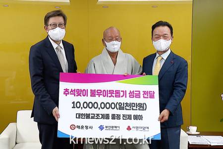 이날 전달식에는 박형준 시장과 대한불교조계종 진제 종정예하. 최금식 부산사회복지공동모금회 회장, 해운정사 신행·성담·도원스님 등이 참석했다. 진제 종정예하는 이 자리에서 추석 명절에도 코로나바이러스감염증-19(코로나 19)로 어려움을 겪고 있는 부산지역 독거노인 등 취약계층을 위해 성금 1천만 원을 전달했다.