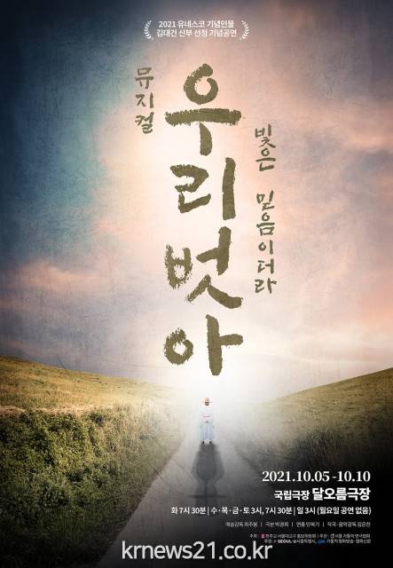 ▲ [사진=홍보포스터]우리나라 최초의 사제 ‘김대건 신부’ 탄생 200주년과 2021 유네스코 세계기념인물 선정을 맞아 천주교 서울대교구(교구장 염수정 추기경)가 주최하고, 서울 가톨릭 연극협회(이하 서가연, 최주봉 회장)가 주관하는 기념 뮤지컬 ‘우리 벗아’가 10월 5일(화)~10일(일) 국립극장 달오름극장에서 공연된다.