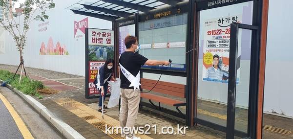 ▲ [사진제공 = 김포시]김포도시관리공사(사장 김동석)는 최근 코로나19 재확산으로 시민들의 불안감이 높아짐에 따라 다중이용 교통시설인 버스승강장에 대한 방역을 실시하고 있다고 밝혔다.