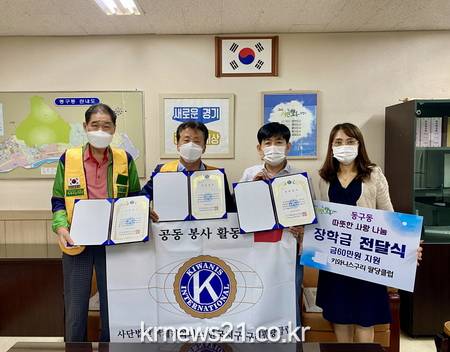 구리시(시장 안승남)는 15일 동구동 주민센터에서, 추석을 맞아 취약계층 아동을 위해 봉사단체‘키와니스 구리팔당클럽’이 후원한 장학금 60만 원을 전달했다.