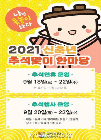 ▲ [사진=홍보포스터]부산시(시장 박형준) 정관박물관은 오는 20일부터 22일까지 3일간 추석을 맞아 박물관을 찾은 어린이들을 대상으로 비대면 체험교육행사 「신축년 추석맞이 한마당」을 운영한다고 밝혔다.