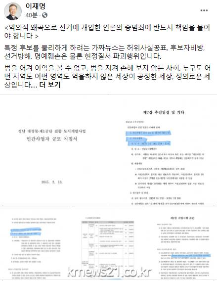 ▲ [이미지출처 = 이재명 경기도지사 페이스북 캡처]더불어민주당 대권 주자인 이재명 경기지사 캠프가 '성남시 대장동 개발 특혜 의혹'과 관련해 야권의 특별검사 및 국정조사에 반대한다는 입장을 밝혔다.
