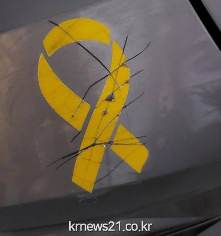 ▲ [커뮤니터 보배드림 캡처]'세월호 노란 리본 스티커'를 붙여 둔 차량이 이틀 연속 칼로 테러를 당했다는 사연이 전해지며 논란이 일었다.