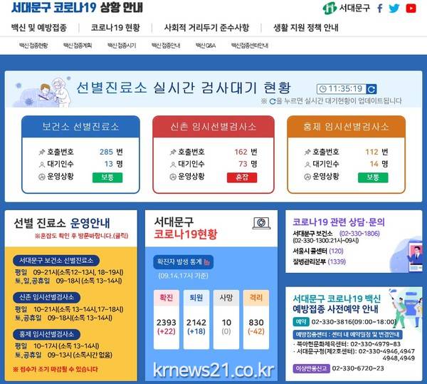 이로써 스마트폰이나 PC를 통해 서대문구 홈페이지에 접속하면 서대문구보건소 선별진료소, 신촌임시선별검사소, 홍제임시선별검사소 등 3곳의 대기 현황을 실시간으로 확인할 수 있다.
