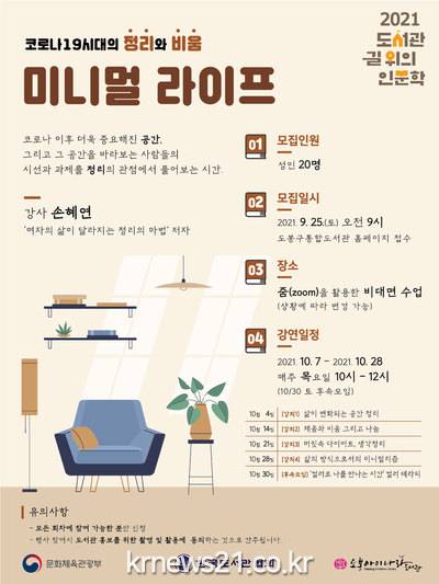 ▲ [사진=홍보포스터]문화체육관광부 주최 ‘2021 도서관 길 위의 인문학’ 수행기관으로 선정된 도봉구(구청장 이동진) 도봉아이나라도서관은 코로나19 속 더욱 중요해진 주거공간과 그 속에 머무는 우리들의 내면 성찰해보는 인문학 강좌 ‘정리와 비움, 미니멀라이프’를 진행한다.