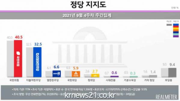 리얼미터(여론조사기관) 여론조사에서 국민의힘이 40.5%로 역대 지지율 최고치를 경신했다. 문재인 대통령의 국정수행 지지도는 40.2%로 조사됐다.