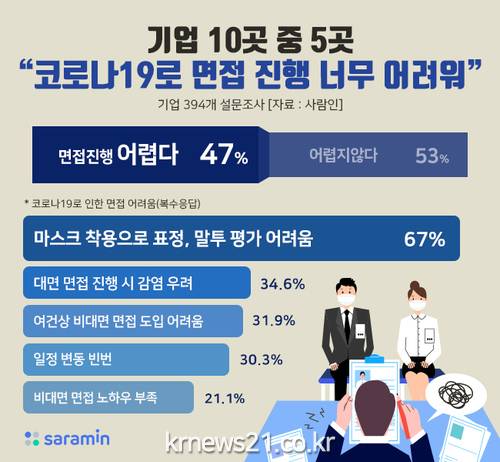구인구직 매칭 플랫폼 사람인(www.saramin.co.kr 대표 김용환)이 기업 394개사를 대상으로 ‘코로나19로 인한 면접 어려움’에 대해 조사했다.