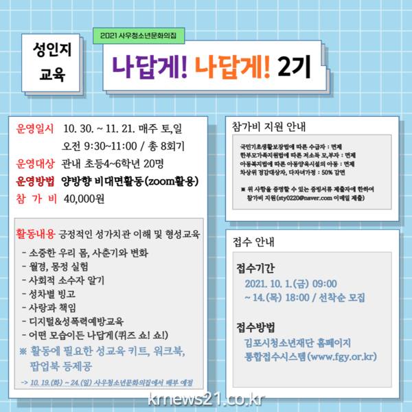 ▲ [사진=홍보포스터](재)김포시청소년재단 사우청소년문화의집에서는 관내 청소년들에게 올바른 성지식 확립과 건전한 성가치관 정립을 위해 성인지교육 ‘나답게! 나답게!’ 2기를 운영한다.