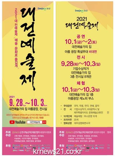 ‘21년 대전예술제’ 본 행사는 대면 행사로 10월 1일부터 3일까지 문화재단 예술가의 집 1층 (아름 광장)에서 개최된다.