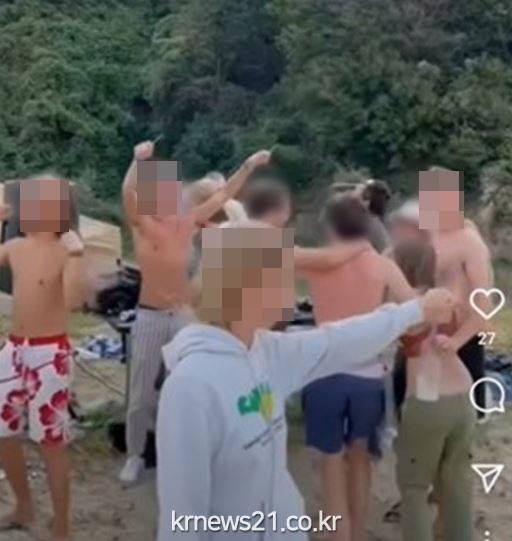영상에는 해변가를 따라 텐트 수십 개가 줄지어 있고, 수십 명의 외국인들이 뒤엉켜 춤을 추는 모습이 들어있다. 이들은 하나같이 마스크를 쓰지 않은 상태였다.