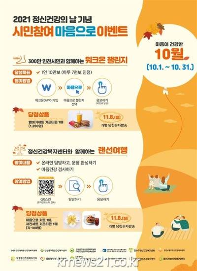 인천광역시(시장 박남춘)는 10월 10일‘정신건강의 날’을 기념해 시민 참여 이벤트를 10월 1일부터 한 달간 진행한다고 밝혔다.