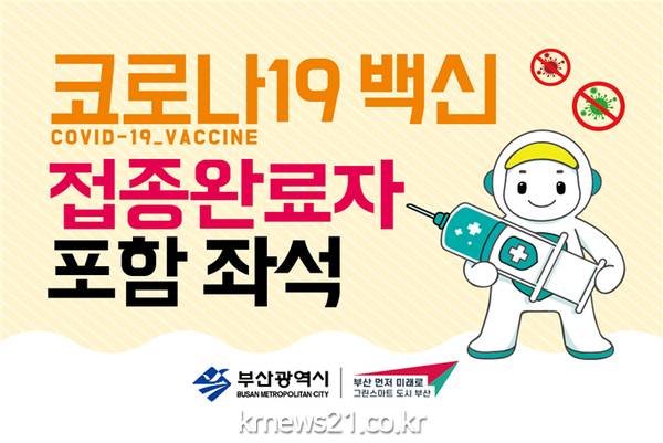 ▲ [사진=홍보포스터]부산시(시장 박형준)가 백신 접종 완료자 동반 여부 확인을 위해 관내 안심식당과 위생등급제 지정 음식점 3천600여 곳에 ‘코로나19 백신 접종 완료자 포함 좌석 안내 표지’를 배부한다고 밝혔다.