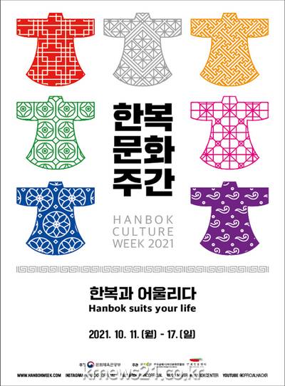 ▲ [사진=홍보포스터]문화체육관광부(장관 황희, 이하 문체부)는 한국공예‧디자인문화진흥원(원장 김태훈) 한복진흥센터와 함께 10월 11일(월)부터 17일(일)까지 ‘한복과 어울리다’를 주제로 ‘2021 가을 한복문화주간’ 행사를 연다.