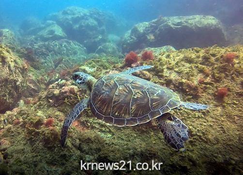 ▲ [사진제공 = 국립공원공단]환경부 산하 국립공원공단(이사장 송형근)은 최근 한려해상국립공원에 속한 홍도 인근 해역에서 국제적 멸종위기종인 '푸른바다거북'을 발견하고, 영상으로 포착했다고 밝혔다.