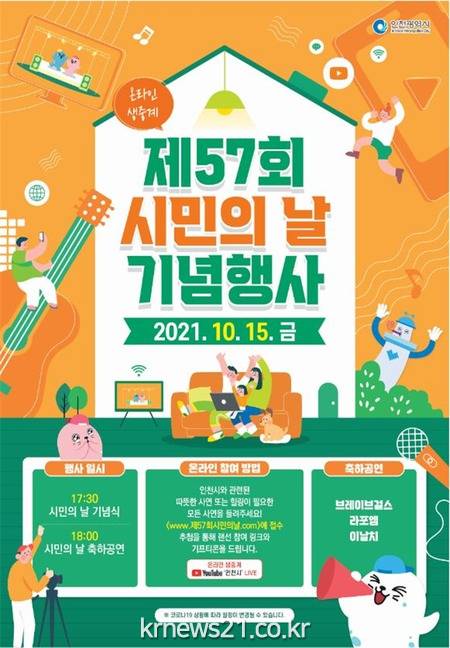 ▲ [사진=홍보포스터]인천광역시(시장 박남춘)는 코로나19로 인해 대면행사를 개최할 수 없어 시민과 함께할 수 있는 방안으로 인천시 유튜브를 활용한 온라인 기념식 및 축하공연을 추진한다고 밝혔다.