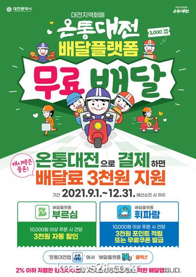 온통대전 배달플랫폼에서는 9월부터 1만 원 이상 주문하면 건당 3천원의 배달료가 제공하는 무료배달 서비스가 진행 중이다.