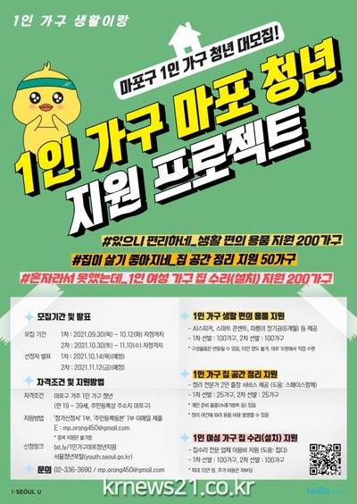 지원 자격은 마포구에 거주하는 만 19세부터 39세 이하의 1인 가구 청년이며, 신청 방법은 서울청년포털(www.youth.seoul.go.kr) 또는 구글폼(www.bit.ly/1인가구마포청년지원)에서 신청서를 다운 받아 주민등록등본 1부와 함께 이메일(mp.orang450@gmail.com)로 제출하면 된다.