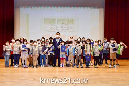 ▲ [사진제공 = 중랑구]중랑구(구청장 류경기)가 지역 아동들의 독서습관을 형성하기 위해 같은 또래 친구들이 독서할 수 있도록 옆에서 도와주고 독서문화를 전파하는 어린이 독서 리더, ‘중랑 어린이 북스카우트’를 운영한다. 14일 1기 임명식을 시작으로 1년간 본격적인 활동에 나설 예정이다.