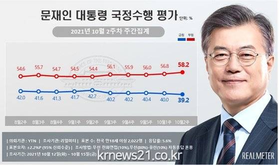 18일 리얼미터가 YTN의 의뢰를 받아 지난 12~15일까지 성인 남녀 2022명을 대상으로 문 대통령 국정 수행 지지도(긍정평가)를 조사해 발표한 결과에 따르면 응답자의 지난 조사보다 0.8%포인트(p) 하락한 39.2%(매우 잘함 22.5%, 잘하는 편 16.7%)로 나타났다. 문 대통령 지지율이 40%를 하회한 것은 6월 5주차 조사(38.0%) 이후 14주 만이다.