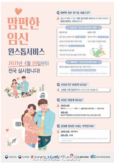 ‘맘편한 임신 원스톱 서비스’는 임신·출산 진료비 지원, 엽산·철분제 제공, KTX 요금 할인 신청 등 임산부에게 제공되는 여러 서비스를 ‘정부24’ 또는 행정복지센터·보건소에서 한 번에 안내받고 신청하는 서비스다.