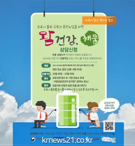 이번 사업은 ‘뫔(몸 + 마음) 건강, 채움’이라는 주제로 코로나 장기화로 인해 마음 충전이 필요한 시민들을 대상으로 심리 건강상담을 제공하는 코로나블루 극복 프로젝트다.