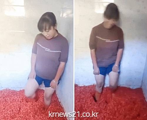영상에는 한 여성이 장화, 모자 등 위생을 위한 장비를 착용하지 않고 맨발로 고춧가루를 밟아 양념장을 만드는 모습이 담겨있었다.