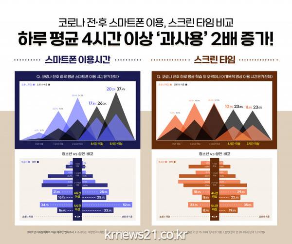 대한민국의학한림원이 전국 만 15세~18세 청소년 271명, 만 20~69세 성인 1013명을 대상으로 진행한 ‘디지털미디어 과사용 실태 대국민 인식조사 결과’ 코로나 펜데믹 이후 디지털미디어 과사용 그룹이 약 2배 증가한 것으로 나타났다.