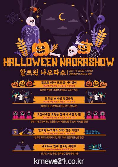 ▲ [사진=홍보포스터]소금산 출렁다리에 이어 나오라쇼 개장으로 원주 관광의 중심으로 자리 잡은 간현관광지에서 할로윈데이를 맞아 또 하나의 이색 볼거리인 ‘할로윈 나오라쇼’가 화려하게 펼쳐진다.